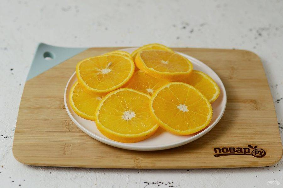 Апельсины помойте, обсушите. Нарежьте кружочками толщиной полсантиметра. Отварите апельсины в кипящей воде примерно 4-5 минут, затем откиньте на сито, чтобы стекла лишняя жидкость. Это уберет лишнюю горечь из кожуры.