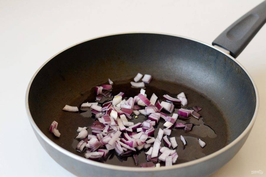 Порубите красный лук, затем обжарьте на сковороде до мягкости.