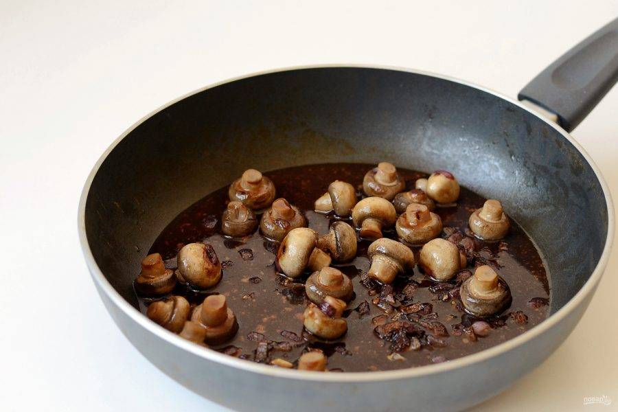 Добавьте шампиньоны, обжарьте их до румяной корочки.
