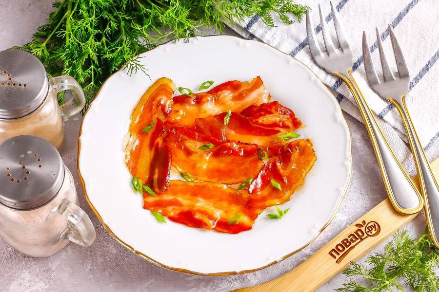 Выложите карамелизированный бекон на тарелку и присыпьте любой измельченной пряной зеленью.