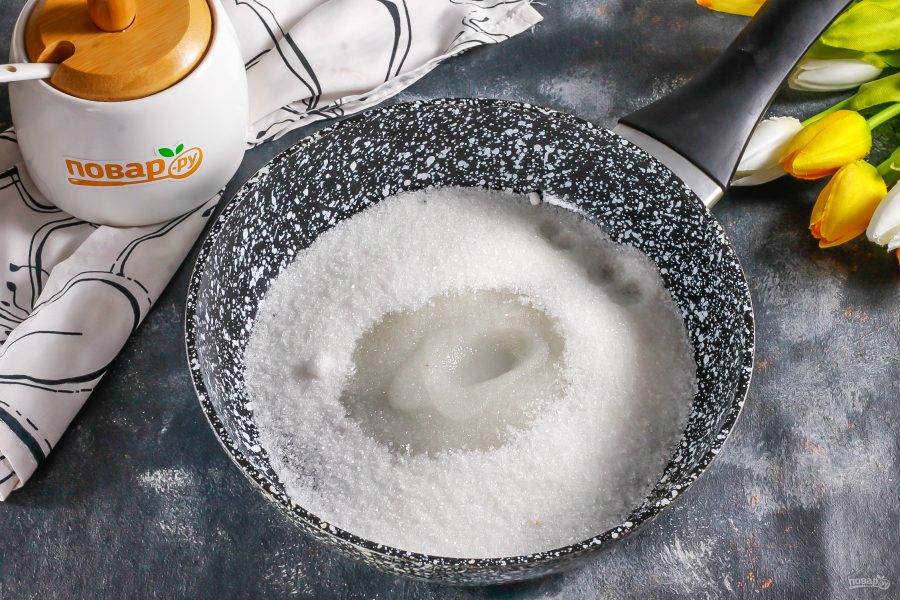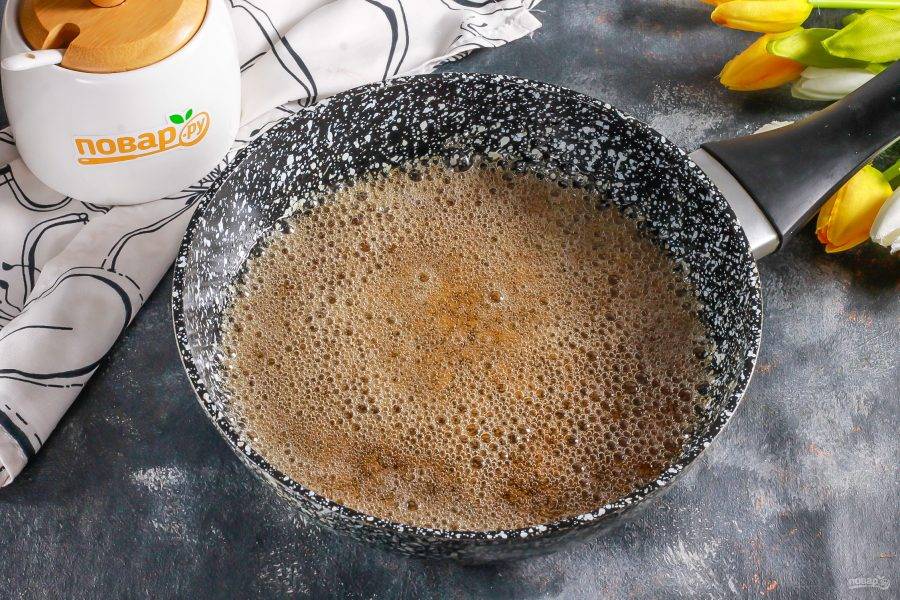 Дождитесь расплавления сахара, когда сахарный сироп приобретет карамельный оттенок. Выключите нагрев, иначе сироп быстро подгорит и почернеет, приобретет горький привкус.