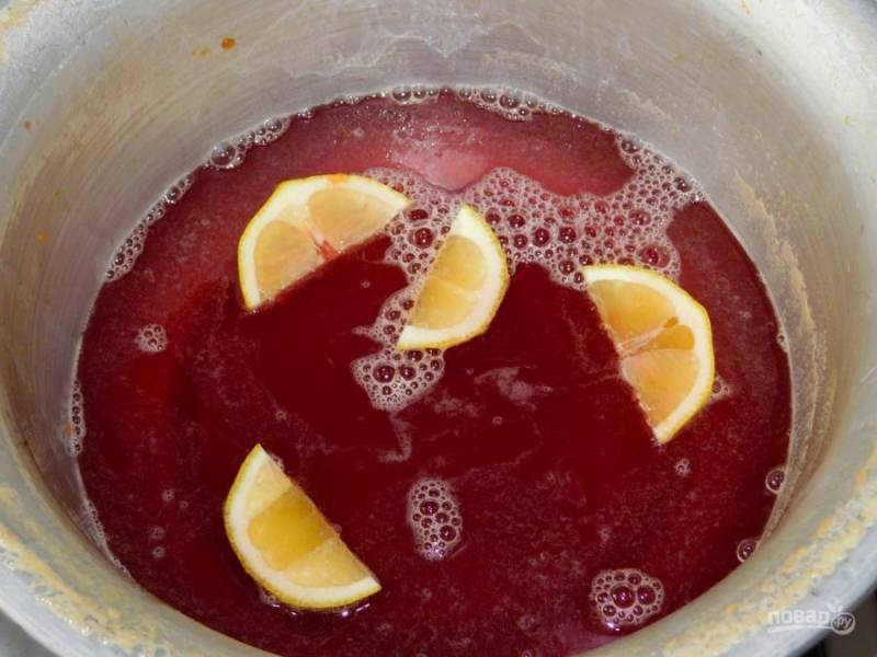Процедите сироп от нектаринов. Из половины лимона выжмите сок, вторую половину нарежьте. Отправьте все в сироп и варите на слабом огне в течение часа. За это время сироп загустеет. Выложите нектарины обратно в сироп и доведите до кипения. Не забывайте в процессе варки снимать пенку.