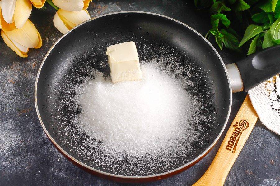 В сковороду всыпьте сахар и выложите сливочное масло. Если сахар не очень хорошего качества, то добавьте вместе с водой и лимонный сок, иначе карамель может закристаллизоваться.