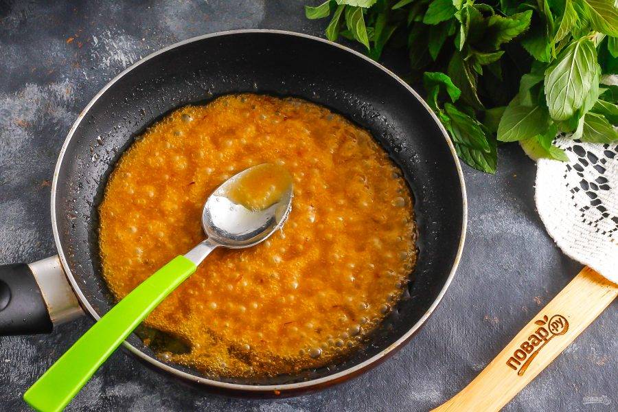 Прогрейте карамель на умеренном нагреве до румяности, и выключите огонь.