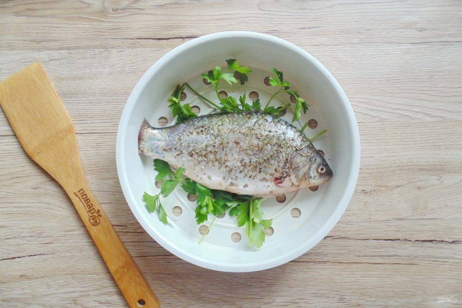 На петрушку выложите рыбу и установите решётку в пароварку.