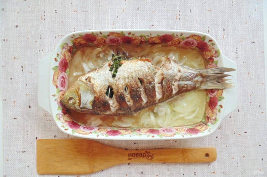 Карась запечённый на луковой подушке готов к подаче на стол.