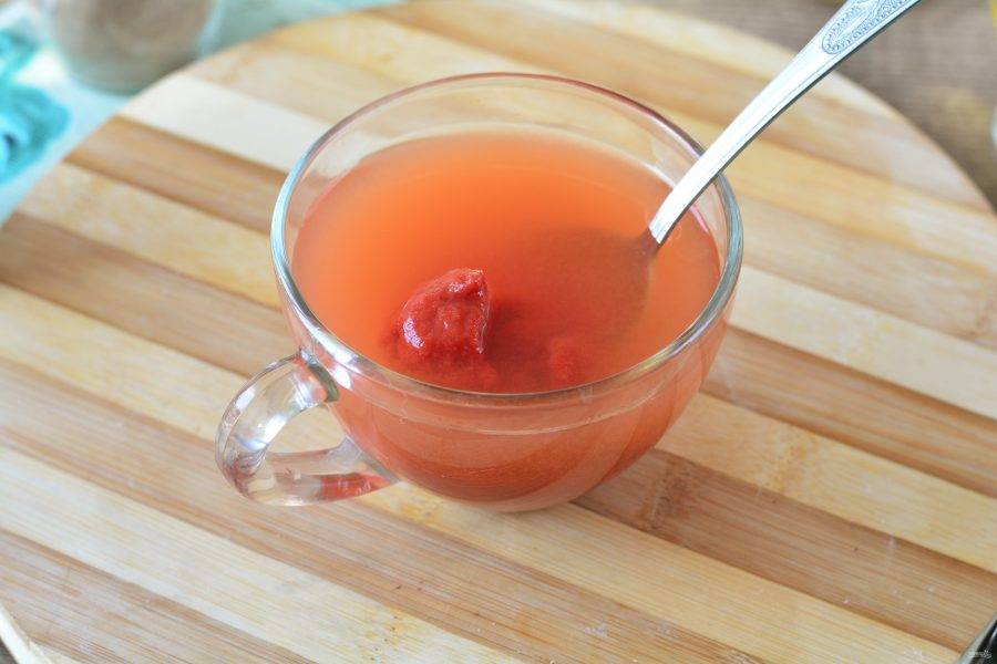 Разведите томатную пасту в воде, размешайте, немного подсолите.
