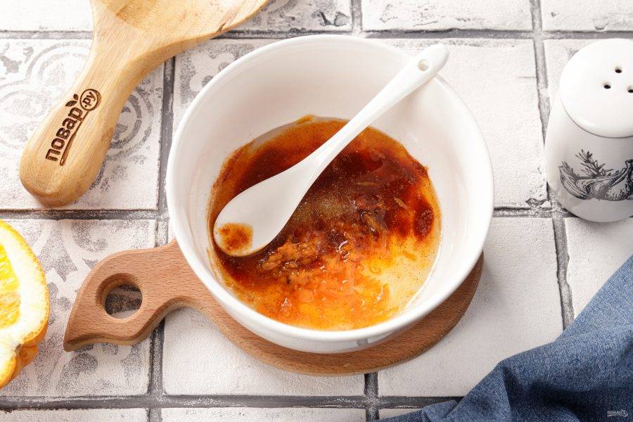 В глубокую посуду влейте растительное масло (20 мл). Всыпьте молотую паприку, сушёный чеснок, цедру апельсина. Перемешайте до однородности.