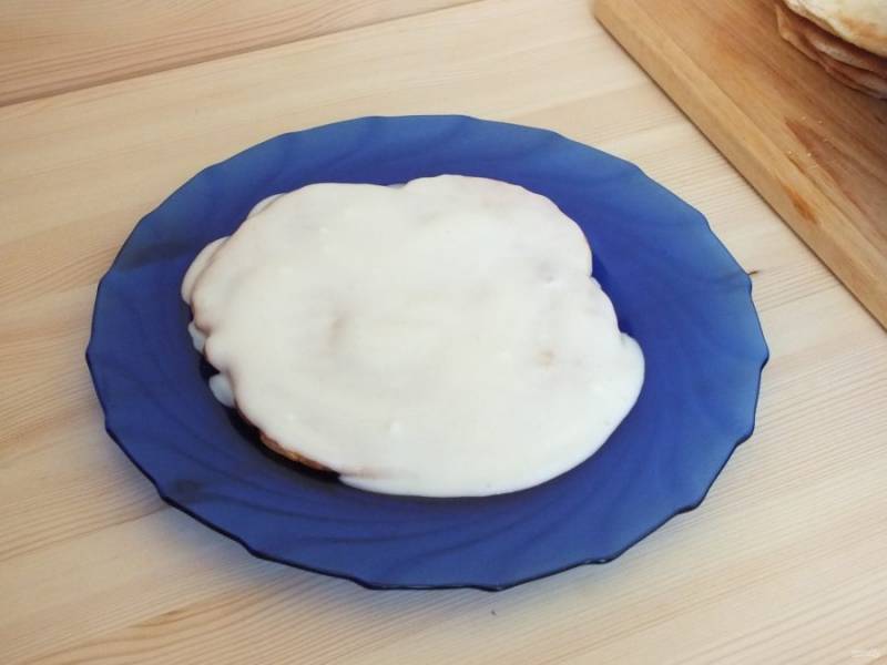 Выпеките все семь коржей, обрежьте края если это необходимо. Сложите друг на друга, прикройте полотенцем и остудите.