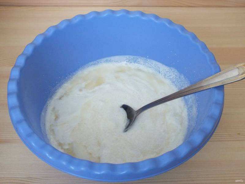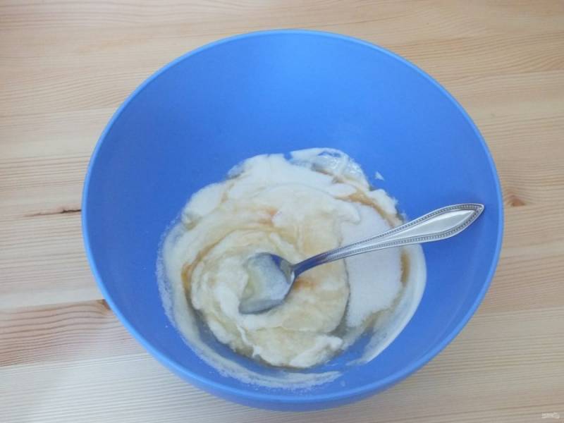 Смешайте в миске 0,5 стакана сметаны, яйцо, соль, 0,5 стакана сахара.