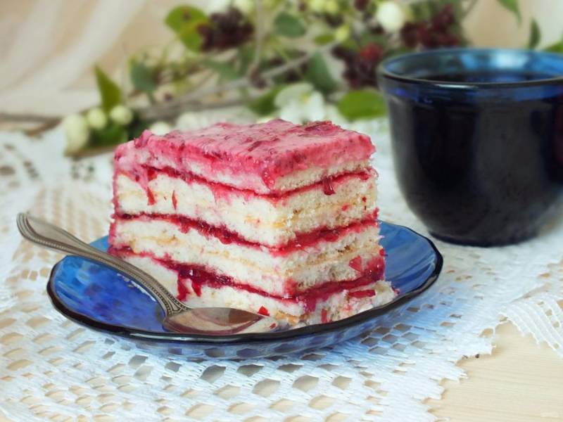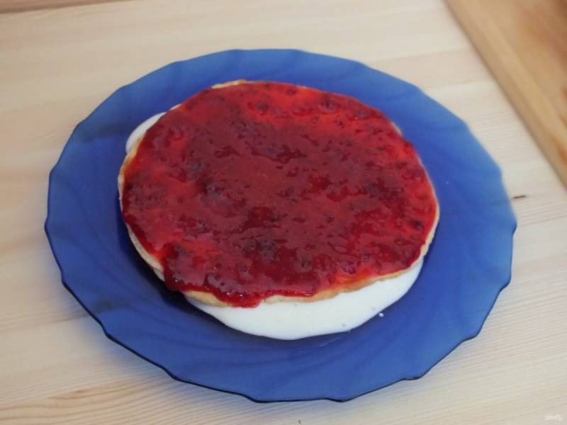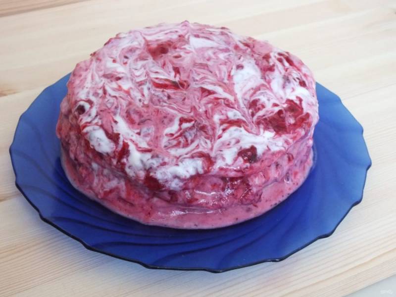 Положите второй корж, смажьте ягодной начинкой. Повторите слой, чередуя крем с начинкой. Не экономьте, все, что стекает с торта, распределите на верхнем корже, в хаотичном порядке.
