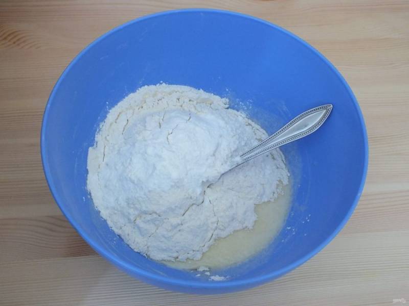 Добавьте муку, разрыхлитель и замесите тесто. Муку добавляйте частями.