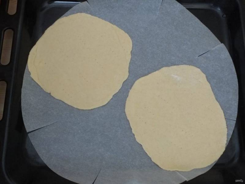Включите духовку на 180 градусов. Раскатайте коржи. Размер коржа ориентировочно 18-20 см.