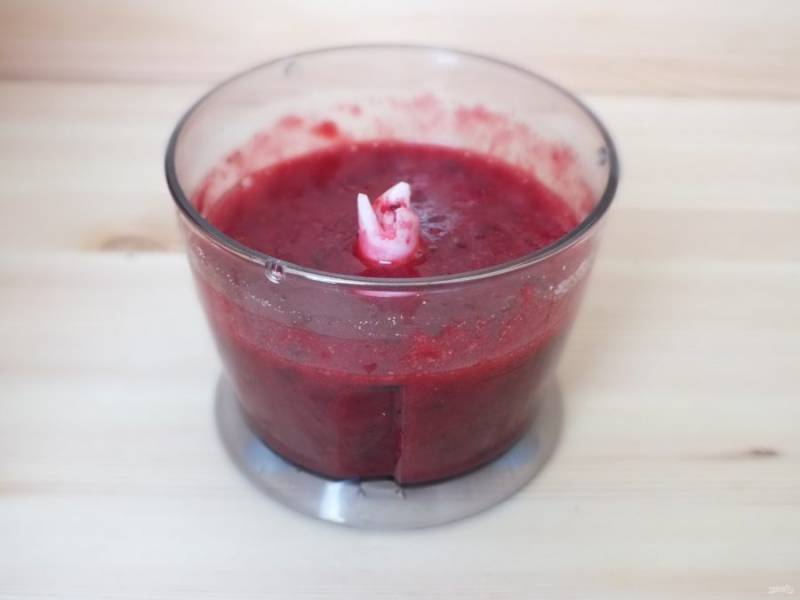 Сделайте начинку. Ягоды с сахаром (0,5 стакана) пробейте в блендере, до однородного состояния.