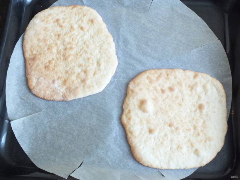 Переложите заготовку на противень (смажьте противень или положите пергамент), проткните вилкой в нескольких местах и выпекайте в течение 4 минут до слегка румяного цвета.