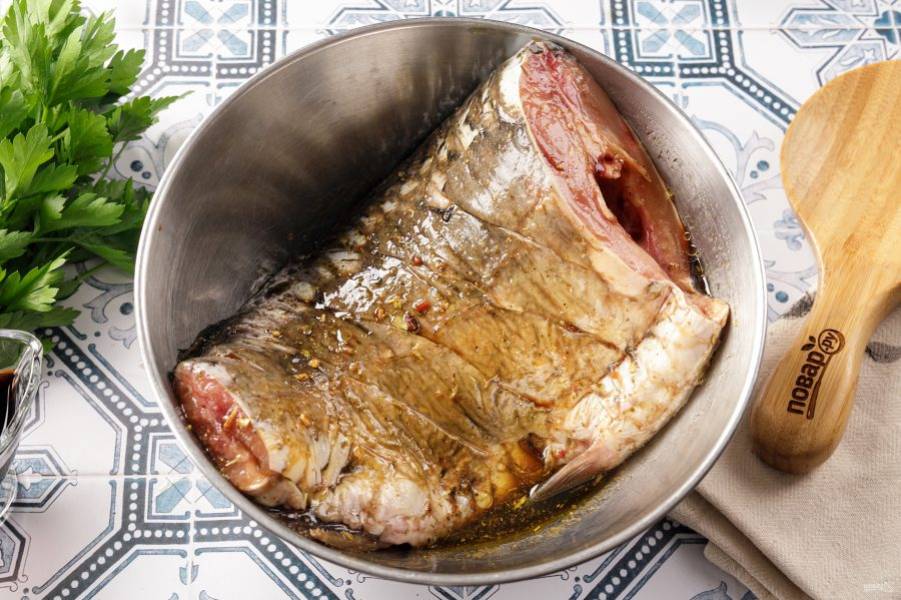 Для маринования лучше всего взять глубокую и не сильно большую миску. Полейте карпа со всех сторон маринадом и ставьте рыбу на 10-15 минут. Периодически переворачивайте карпа и поливайте соусом для равномерного маринования.