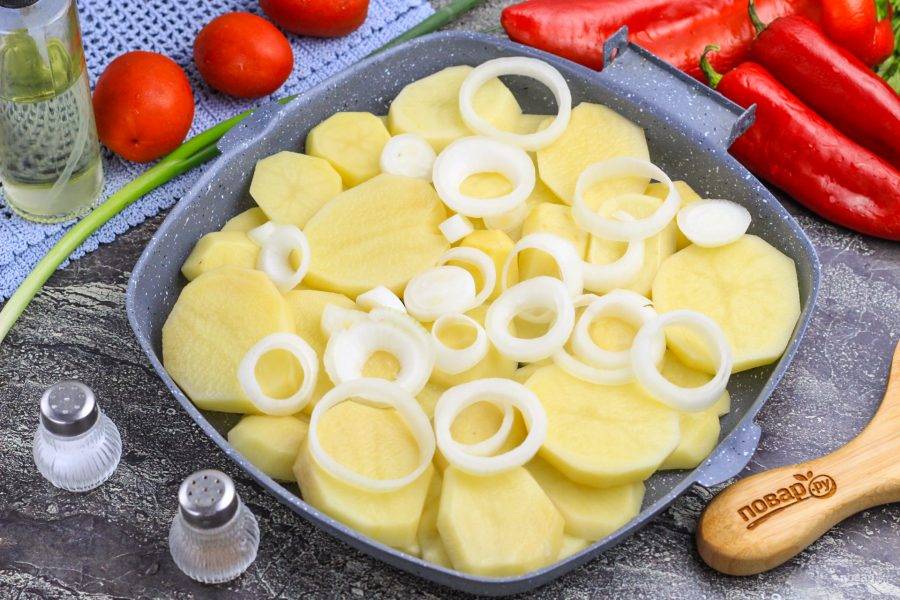 Смажьте форму для запекания растительным маслом. Нарежьте картофель и лук кольцами, выложите в форму сначала картофель, а на него — лук. Посолите, по желанию — поперчите.