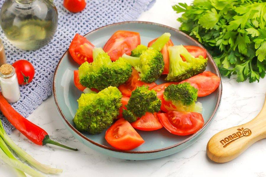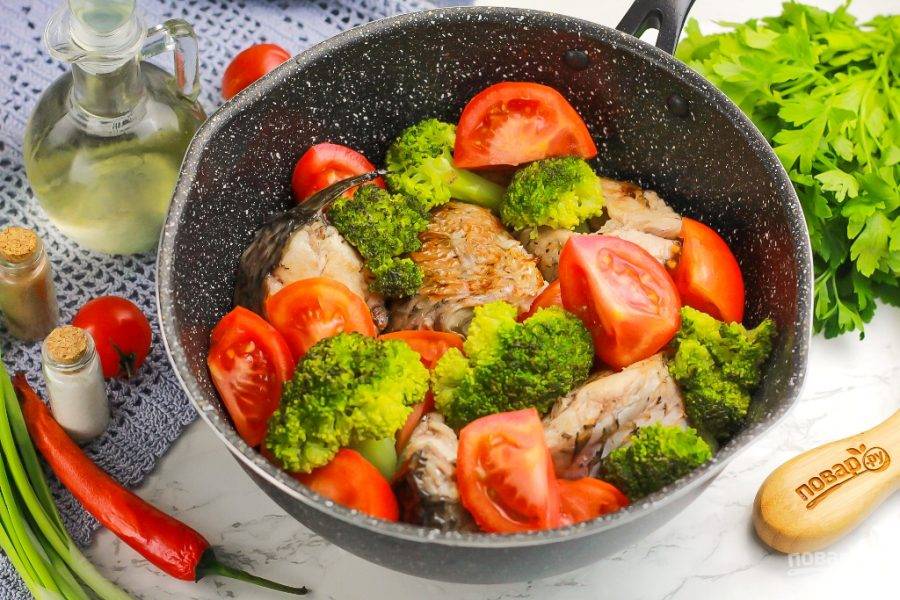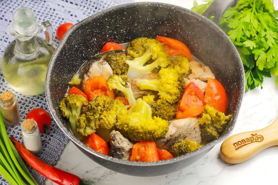 Добавьте в емкость нарезанные томаты и брокколи, посолите и поперчите все. Накройте емкость крышкой и томите на среднем нагреве примерно 15-20 минут. За это время овощи выпустят сок и кусочки рыбы потушатся, пропарятся.