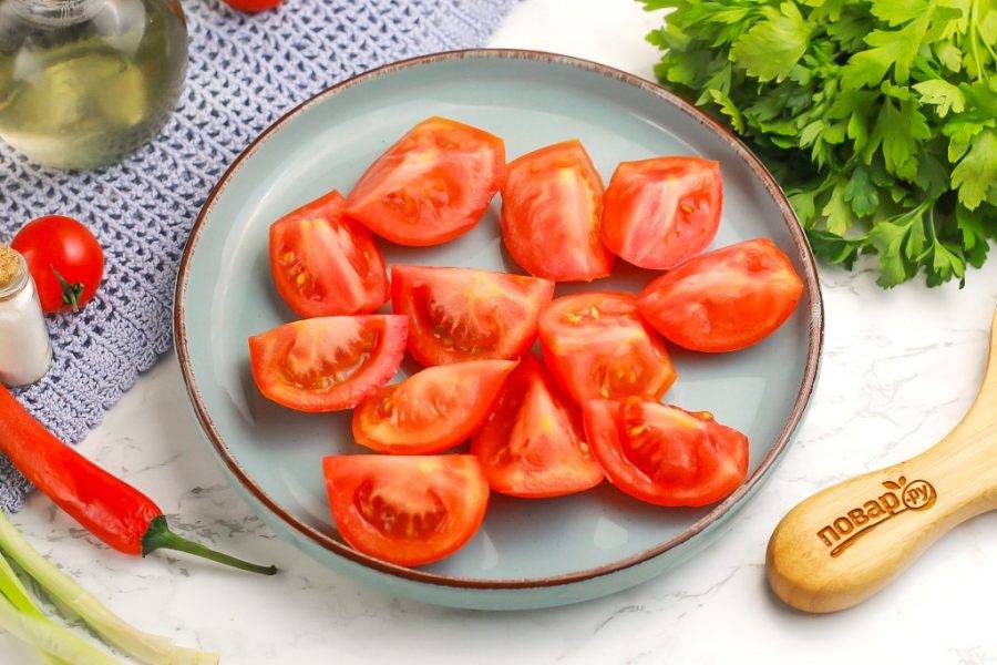 Пока карп обжаривается, промойте помидоры в воде, вырежьте зеленые сердцевинки и нарежьте их крупными дольками.