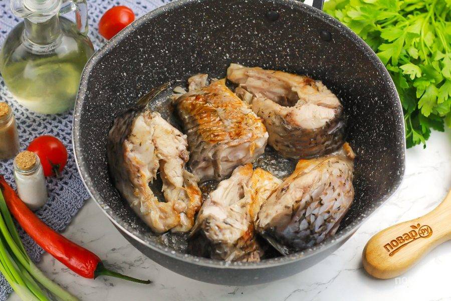 Разогрейте сковороду с высокими бортиками и влейте в нее растительное масло. Выложите в него кусочки карпа и обжарьте на среднем нагреве примерно по 7-8 минут с каждой стороны до румяной корочки.