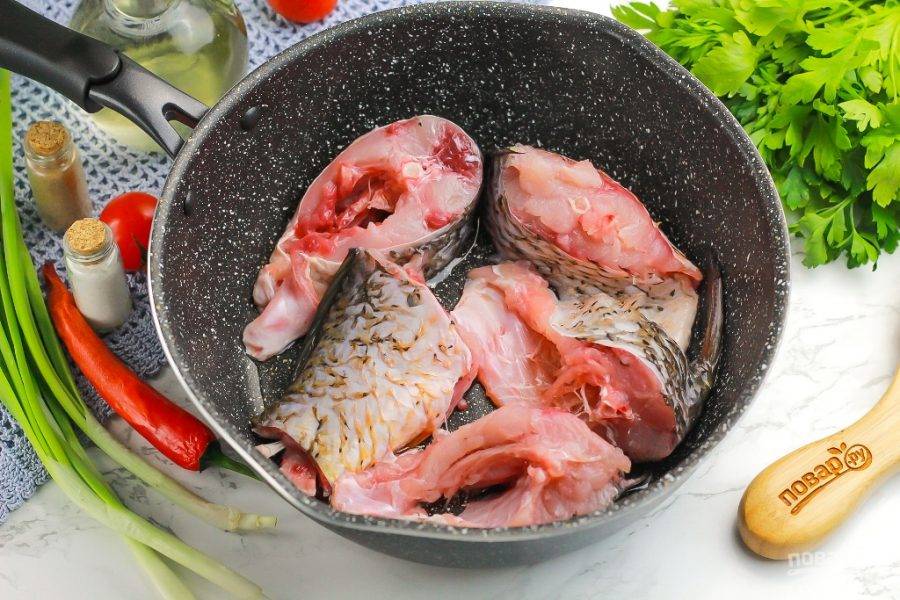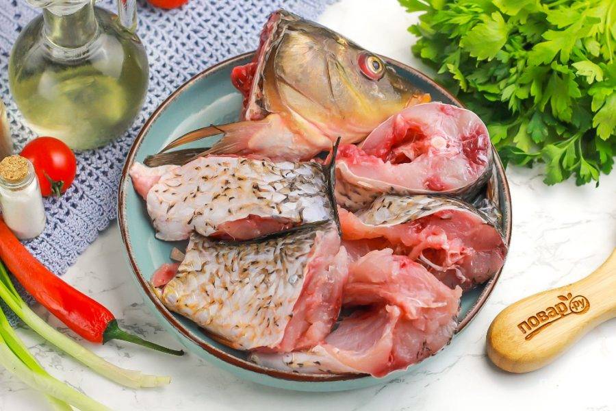Отрежьте голову, хвост, плавники. Тушку нарежьте порционными кусочками любого размера. Можно отфилетировать карпа, если вы не любите, чтобы в блюде попадались косточки.