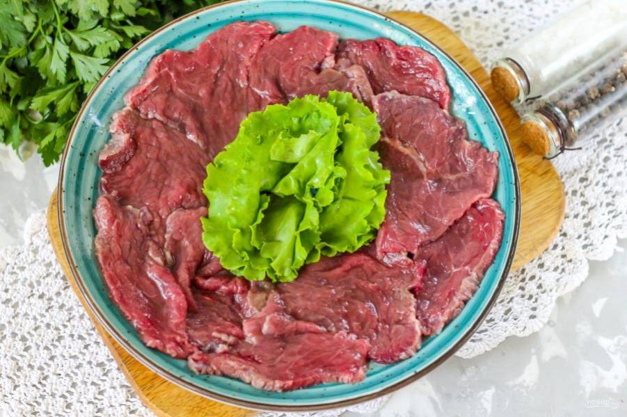 Промойте мясо в воде, подморозьте в морозильной камере примерно 10-15 минут в зависимости от величины куска, чтобы оно легче нарезалось. Аккуратно нарежьте слайсами с помощью острого ножа. Ломтики мяса должны быть очень тонкими. Выложите нарезку в миску или на тарелку.