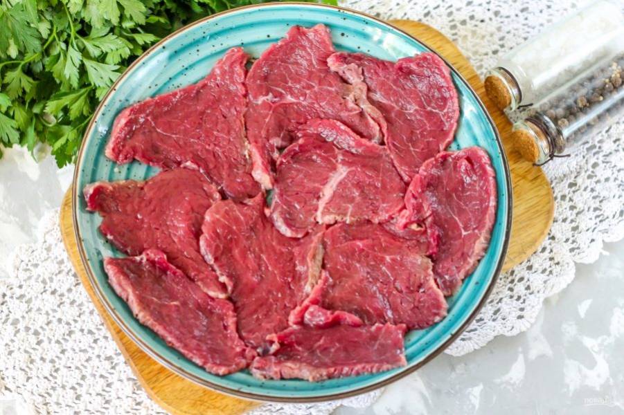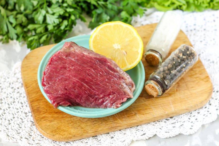 Подготовьте указанные ингредиенты. Говядину выбирайте без сальных прожилок, отдайте предпочтение мякоти.