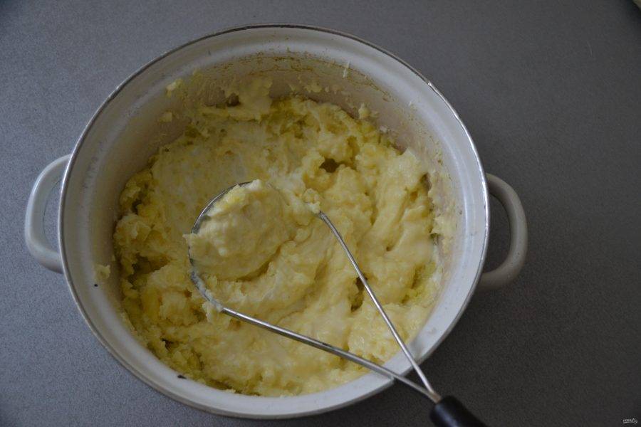 Разомните картофель в пюре, натрите на терке или разомните вилкой мягкий сыр, поперчите.