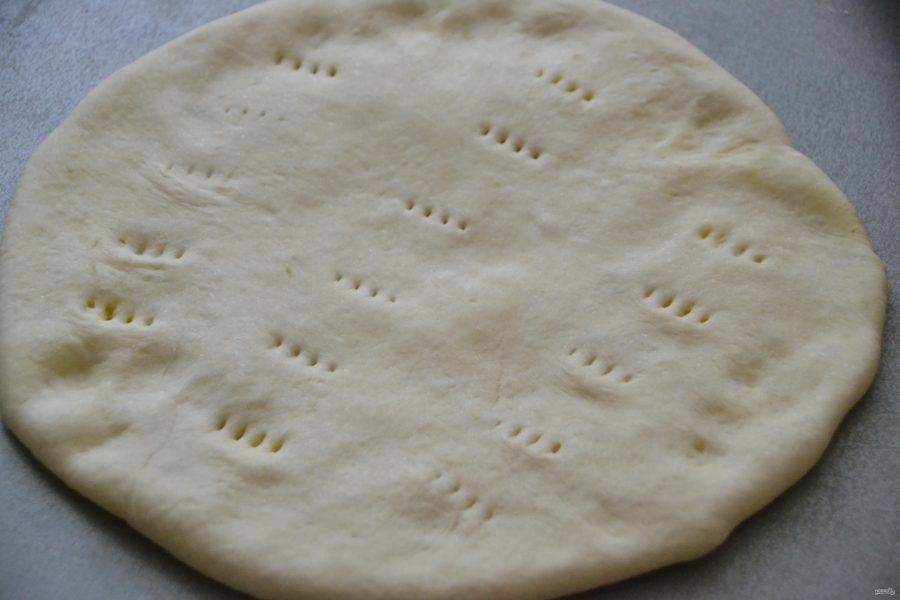 Осторожно разомните в лепешку, стараясь не повредить тесто. Скалку применять не следует, все делается руками. Чтобы лепешка не пузырилась при выпечке, наколите вилкой или сделайте по центру небольшое отверствие.