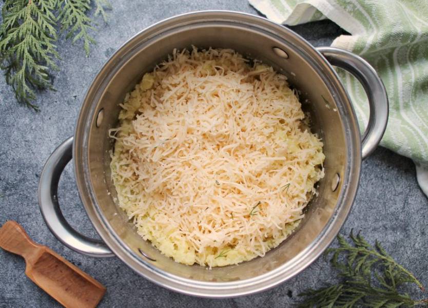 Твердый сыр натрите на мелкой терке, выложите в картофельное пюре и перемешайте до полного растворения сыра и масла.