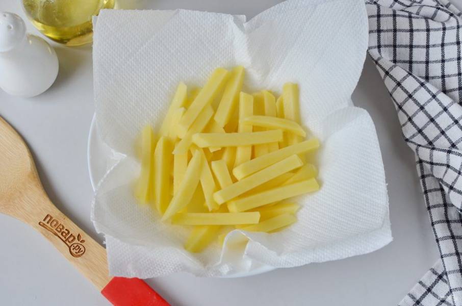 Поставьте кастрюлю с растительным маслом на огонь, пусть масло хорошо разогреется. Картофель обсушите бумажными или хлопковыми полотенцами без ворса, чтобы максимально удалить влагу.
