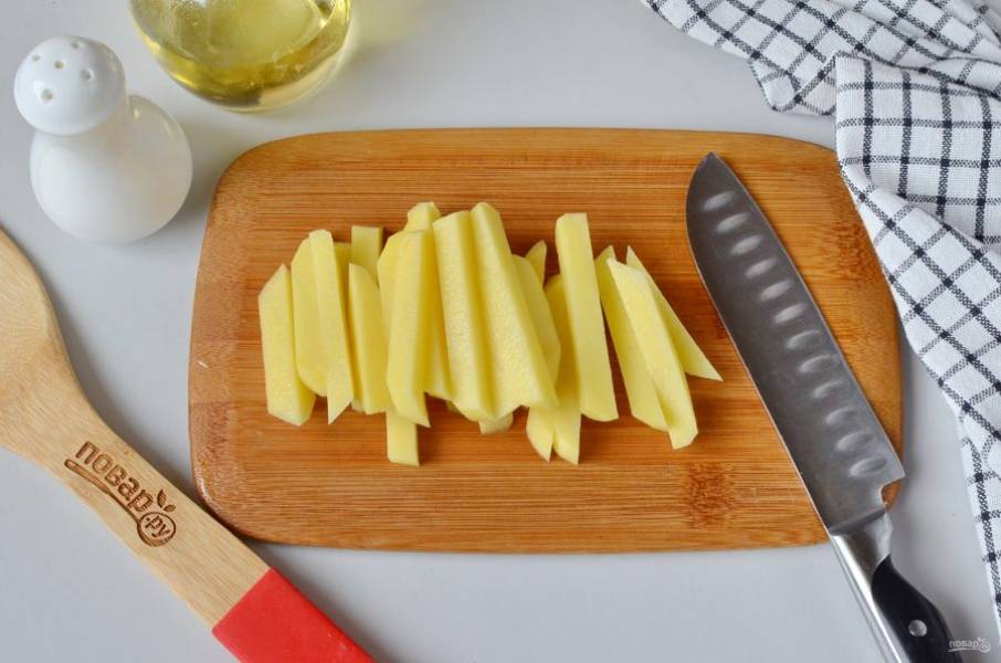 Картофель очистите от кожуры, порежьте соломкой, толщина примерно 5-7 мм.