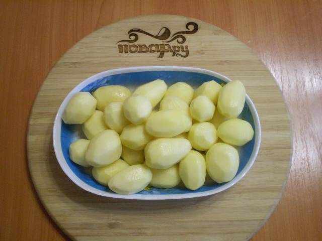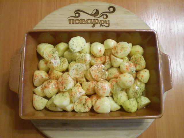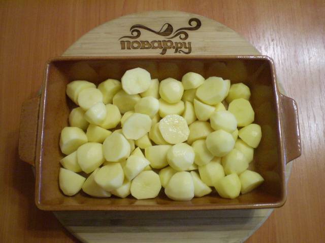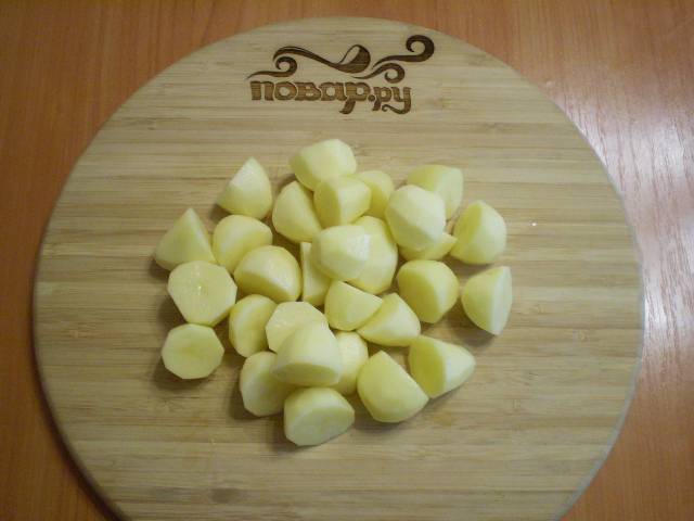 Порежьте картофель кусочками. Картофель у меня мелкий, поэтому я порезала его на половинки, получились достаточно удобные кусочки.
