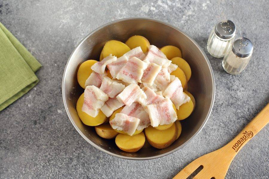 Сало нарежьте слайсами, не сильно тонкими и добавьте к картофелю.