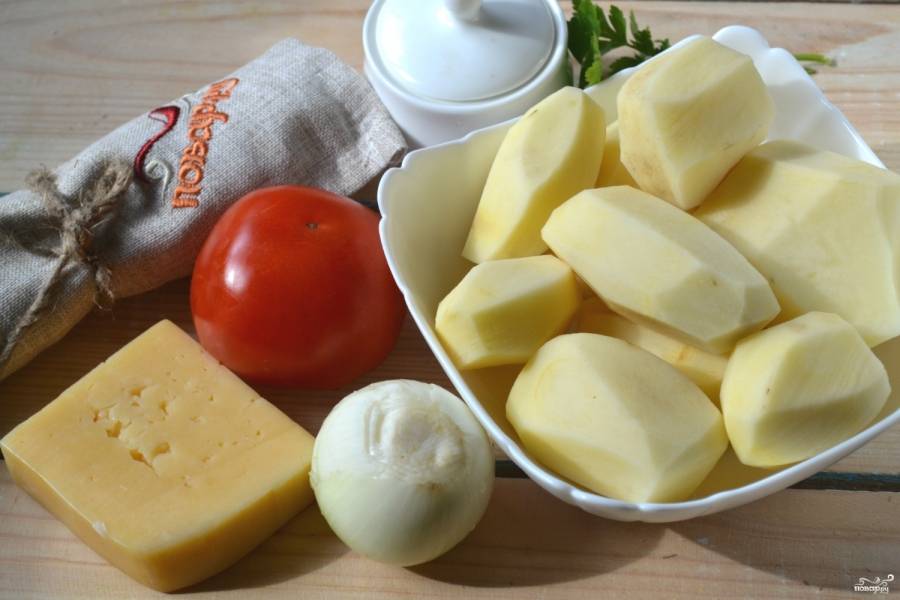 1. Подготовьте все необходимые ингредиенты. Картофель и лук очистите. Картофель порежьте на тонкие пластины. Луковицу и помидор порежьте четвертькольцами.