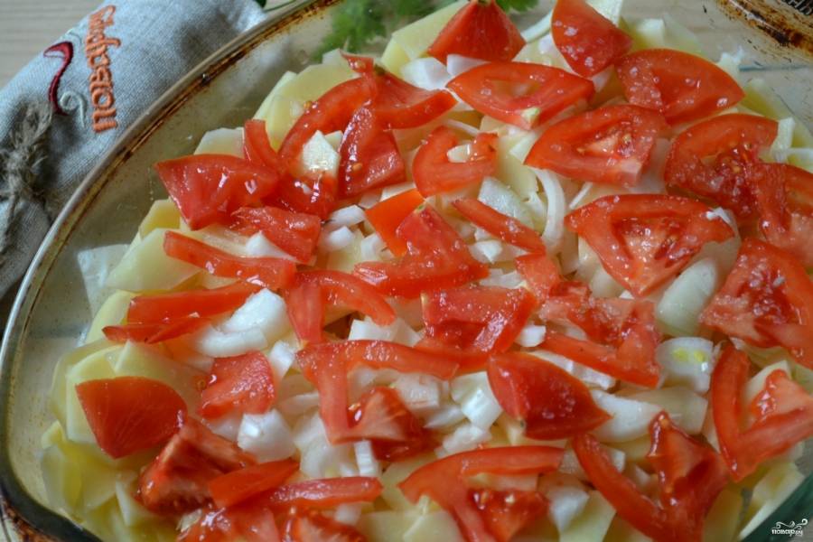 3. Выложите порезанные помидоры. Отправьте форму в духовку на 35-40 минут.