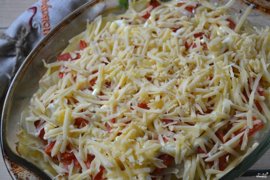 4. За 15 минут до готовности смажьте блюдо майонезом и присыпьте сыром. Это позволит сохранить сочность картофеля и создаст на поверхности красивую шапочку.