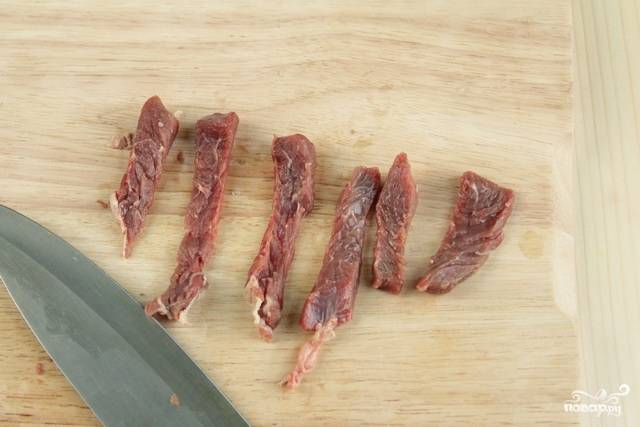 Мясо моем и нарезаем тонкими полосочками. Примерно 1 см в ширину.