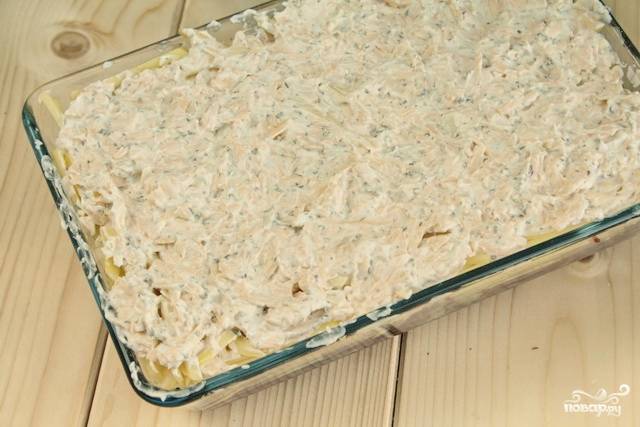 Распределяем сметанно-сырную смесь по поверхности картофеля и ставим запекаться в разогретой до 200 градусов духовке минут на 40-45. Готовность блюда проверяем по картошке - если она мягкая, значит все готово.