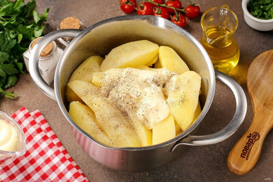 Добавьте к картофелю майонез, растительное масло, соль и молотый перец по вкусу. Если вы предпочитаете сметану, то можете добавить её.