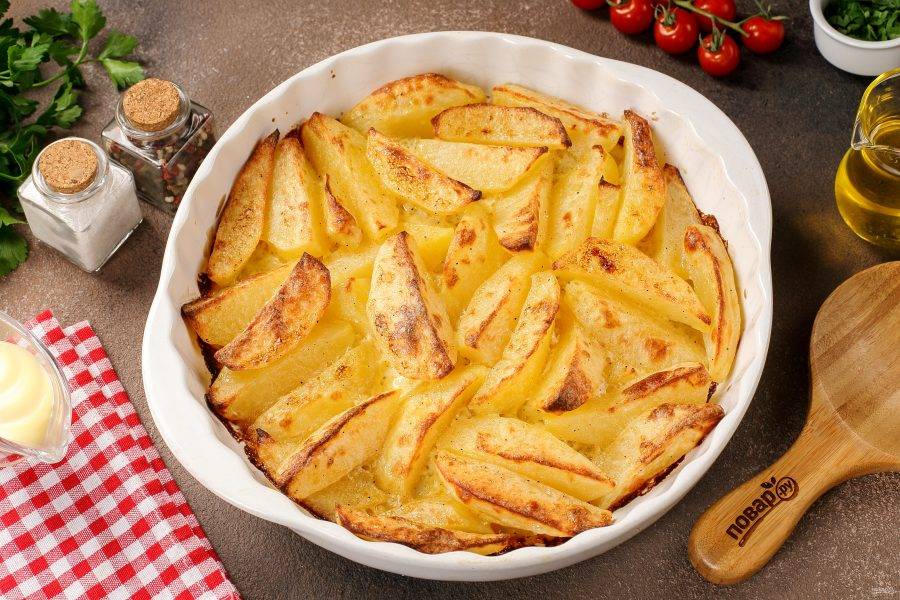 Запекайте картофель в духовке при температуре 180-200 градусов около 30-40 минут. Ориентируйтесь на особенность своей духовки. Готовность картофеля можно проверить ножом.