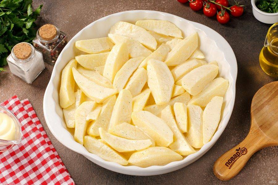 Картошку режьте не слишком тонкими ломтиками. Сначала разрежьте картофель вдоль пополам, а затем ещё на две части каждую.