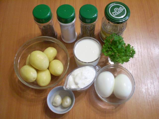 1. Приготовим продукты. Отвариваем яйца вкрутую, очищаем. Моем и чистим картофель.
