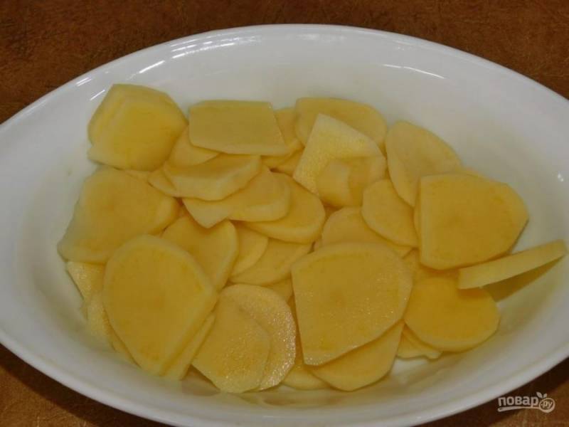 Картофель почистите и нарежьте кружками. Выложите в форму для запекания, смазанную маслом. Немного посолите.