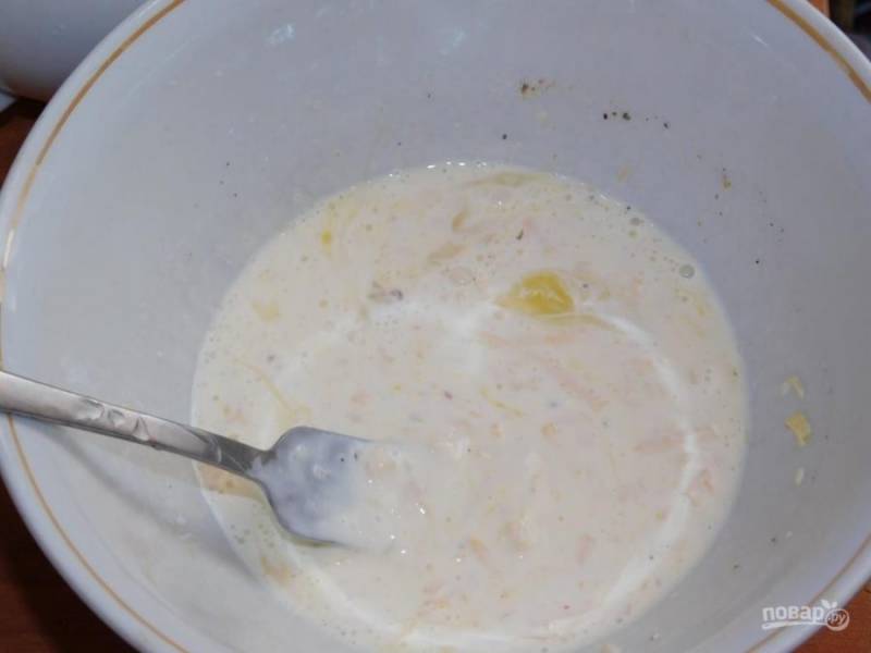 В отдельной чаше смешайте яйцо, сливки, половину тертого сыра.