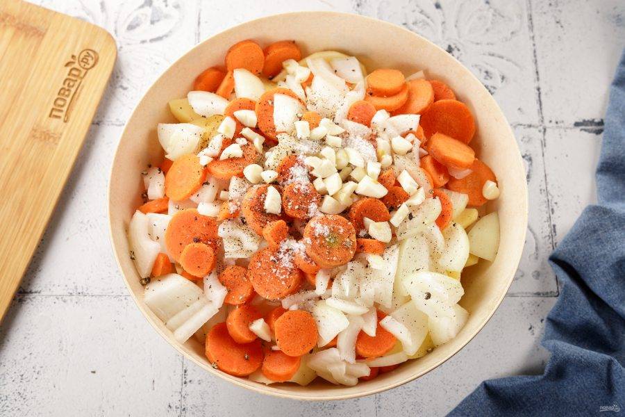 Добавьте к овощам нарезанный кубиками чеснок, соль и молотый перец по вкусу.