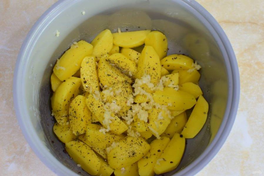 Добавьте соль, специи. Пропустите через пресс чеснок. Все ингредиенты перемешайте. Можно добавить чуть-чуть воды, примерно 50-100 мл.