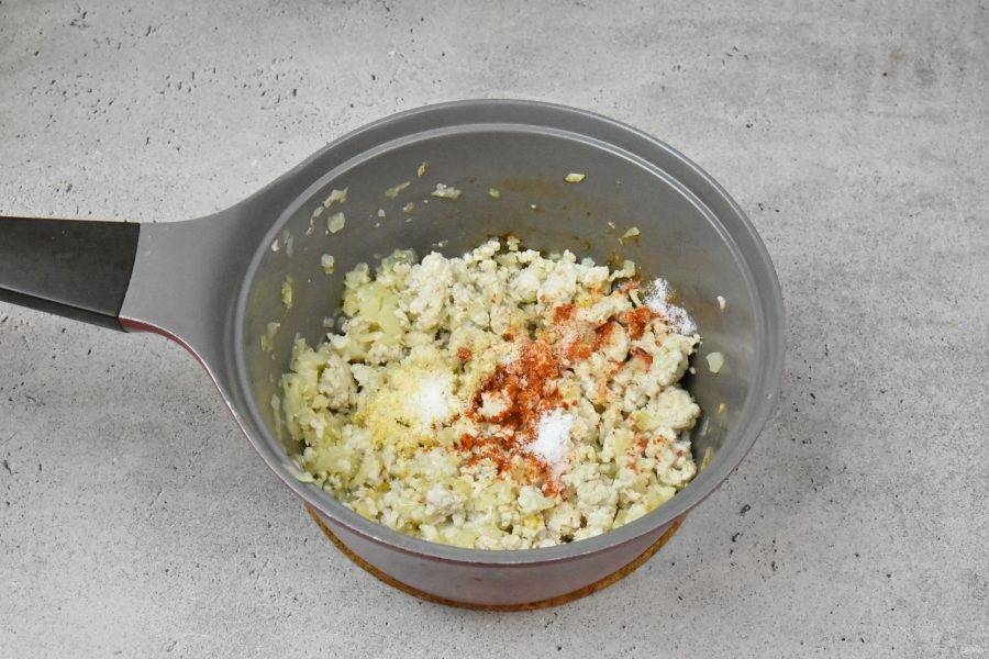 К пассированному луку выложите фарш, обжарьте перемешивая и разбивая комочки деревянной лопаточкой. Добавьте соль и специи по вкусу.