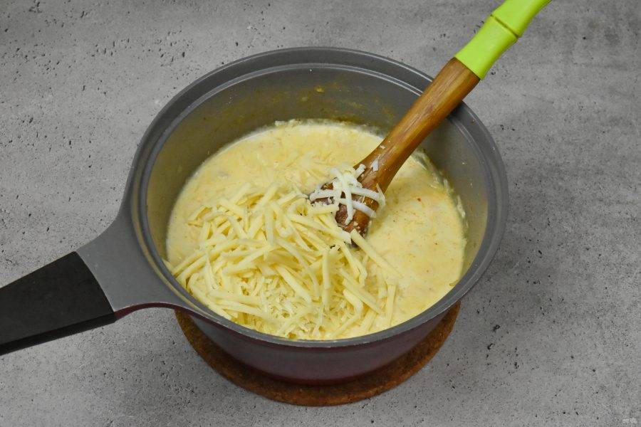 Доведите смесь на медленном огне до закипания и добавьте половину нормы натёртого сыра. Вмешайте его и снимите сотейник с огня.