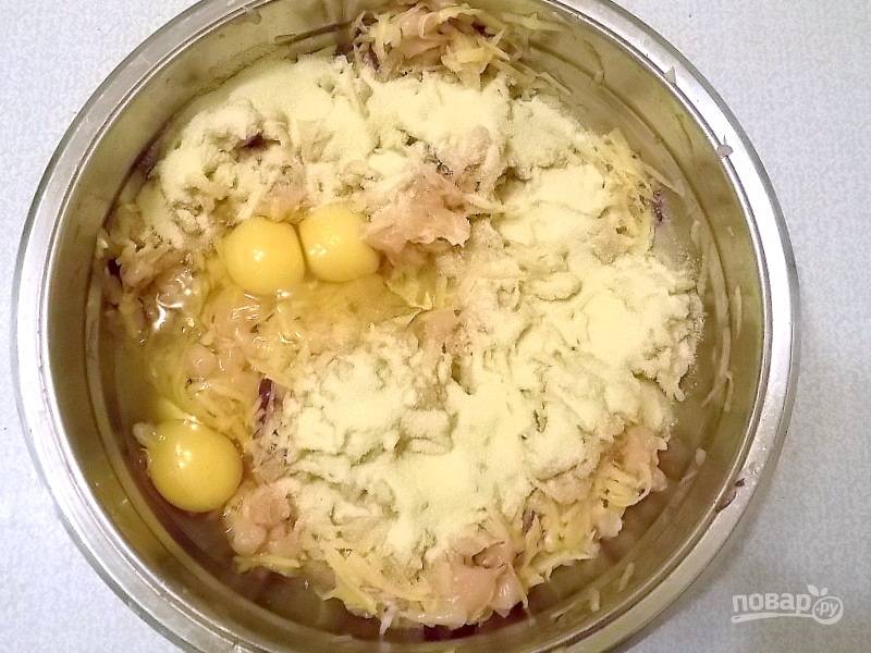 Слейте образовавшийся сок, отожмите массу. Добавьте яйца, манную крупу, перец. Перемешайте и дайте постоять 10 минут.